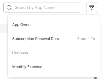 - Filter: Use this filter to quickly filter the tracked app's details based on the App Owner, Subscription Renewal Date, Licenses, and Monthly Expenses.